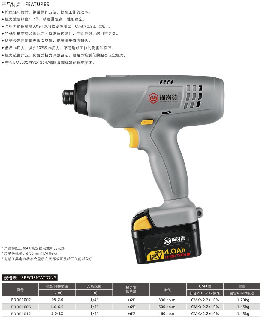 ·槍型輕巧設(shè)計,攜帶操作方便,提高工作的效率 ·扭力重復(fù)精度:6%,精度重復(fù)高,性能穩(wěn)定 ·全扭力范圍警服30%-100%軟硬性測試(CMK>2.2±10%) ·特殊機(jī)械結(jié)構(gòu)及國際專利特殊馬達(dá)設(shè)計,性能更強(qiáng),耐用性更久 ·達(dá)到設(shè)定扭矩值無限次空轉(zhuǎn),提示扭矩值得到達(dá)