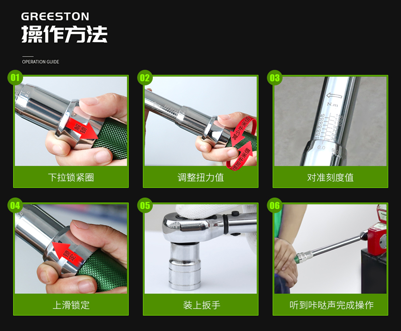 將手柄上的鎖緊圈拉下,轉(zhuǎn)動手柄調(diào)節(jié)預(yù)設(shè)扭力至汽車說明書上的標(biāo)準,推上鎖定扭矩值,裝上套筒,擰緊螺絲。擰到指定扭矩值時,扭力扳手會自動泄力,并發(fā)出“咔噠”聲。這時就表示已經(jīng)完成緊固操作,不要再加力了。如下圖: